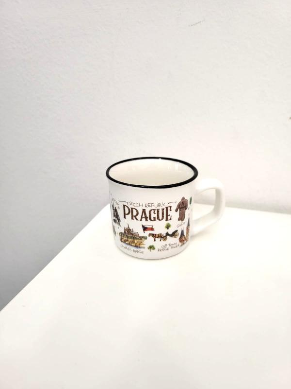 Tazza ricordo di Praga con illustrazioni di monumenti famosi.