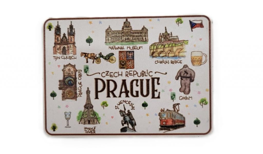 Magnete - Praga famosa Il magnete mostra ciò per cui Praga è famosa. Praga è famosa per i suoi luoghi storici, i mezzi di trasporto e la birra. Celý popis