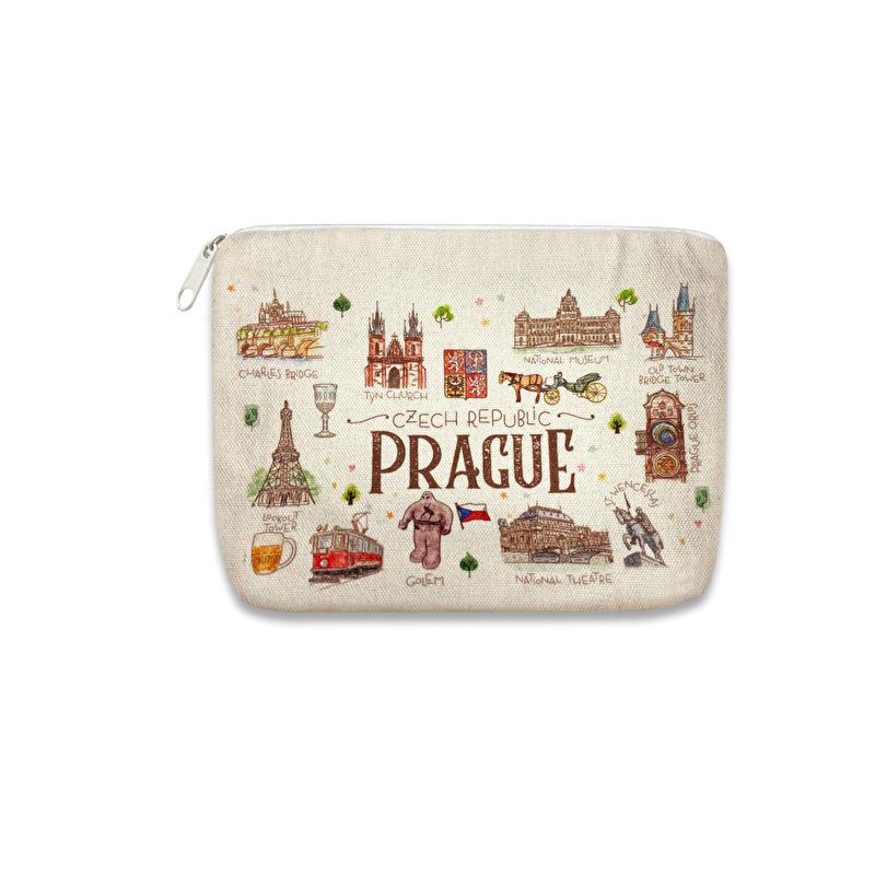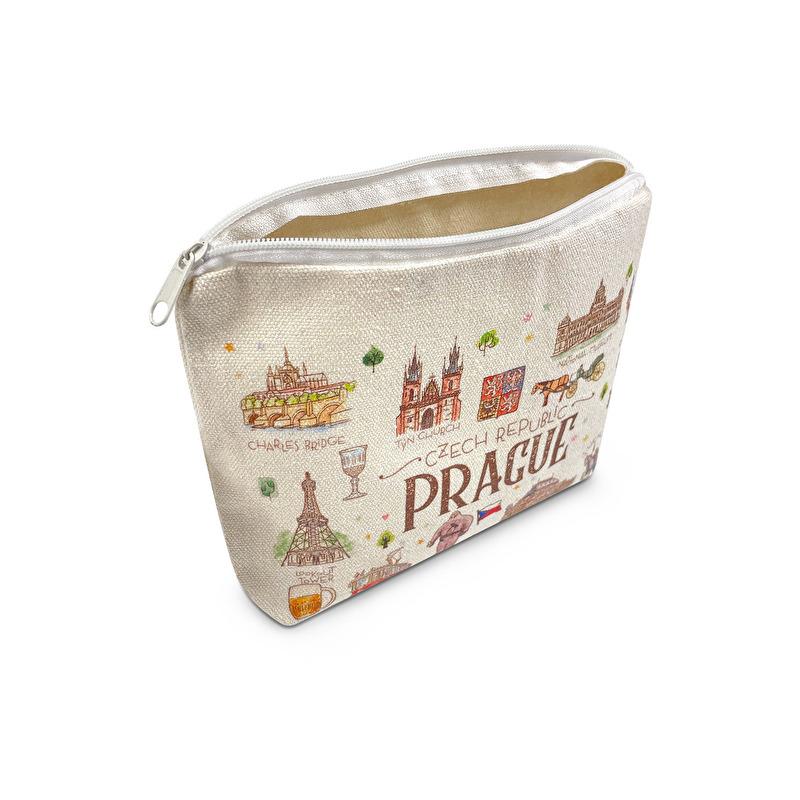 Questa pochette è una piccola opera d'arte e un souvenir perfetto! Mostra tutto ciò che amiamo di Praga e della Repubblica Ceca: dal Ponte Carlo all'Orologio Astronomico e alla Chiesa di Týn, fino a un bicchiere di buona birra e al misterioso Golem. È ideale per cosmetici, monete o piccoli tesori. Porta sempre con te la magia di Praga! Celý popis